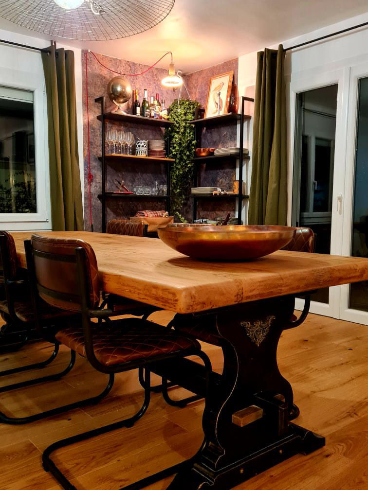 La table de salle à manger en bois de chêne apporte une véritable sophistication à cette pièce. Son design contemporain et épuré s’harmonise parfaitement avec la décoration intérieure moderne. Le pied, en chêne également confère à la table une robustesse et une durabilité exceptionnelles. Il est peint dans une teinte noir métallisée qui laisse penser qu’il est en acier. Les matériaux utilisés sont soigneusement sélectionnés pour créer un équilibre harmonieux entre esthétisme et fonctionnalité.